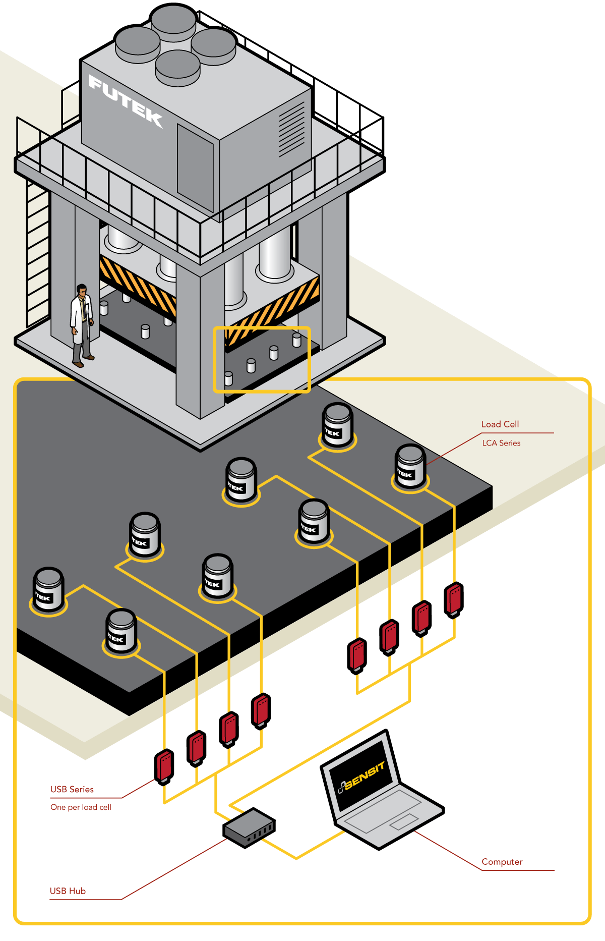 1、在这个应用当中,LCA系列力传感器安装在压力机横梁底下,必须保证力传感器的数量足够多,以确保力传感器足以抗衡压力机的压力。