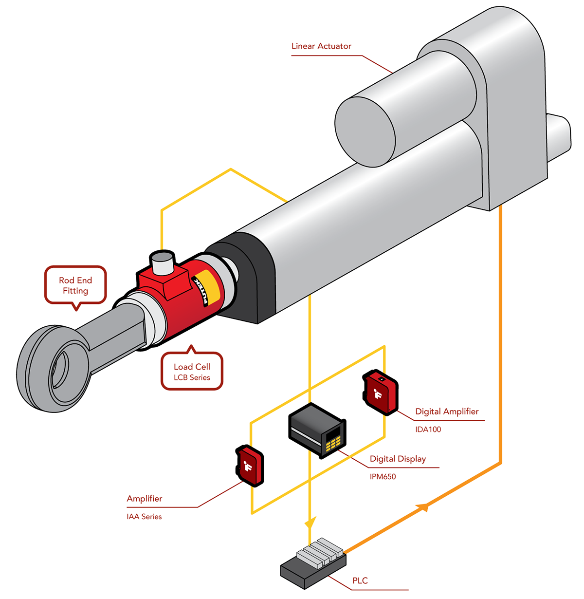 1、LCB系列杆式力传感器的固定端安装在线性执行器的末端。