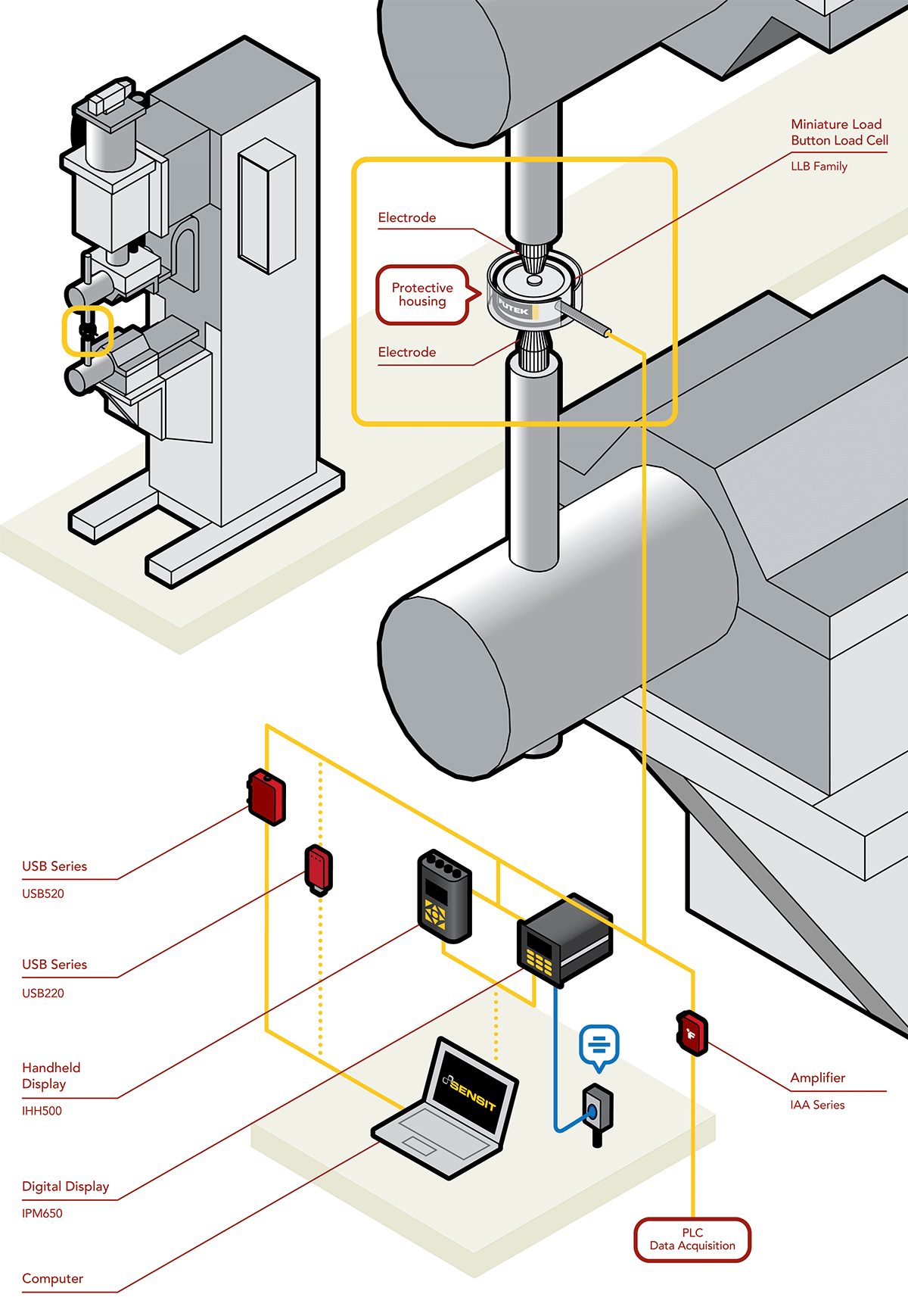 4、在这个应用中,米兰网页版 的 LLB300 微型按钮力传感器被放置在电极之间以校准施加的力。当机器施加压力时,LLB300将感知负载测量,并可以通过 USB 采集方案在 IHH500 手持显示器、IPM650 面板安装显示器或 PC 上显示数值。