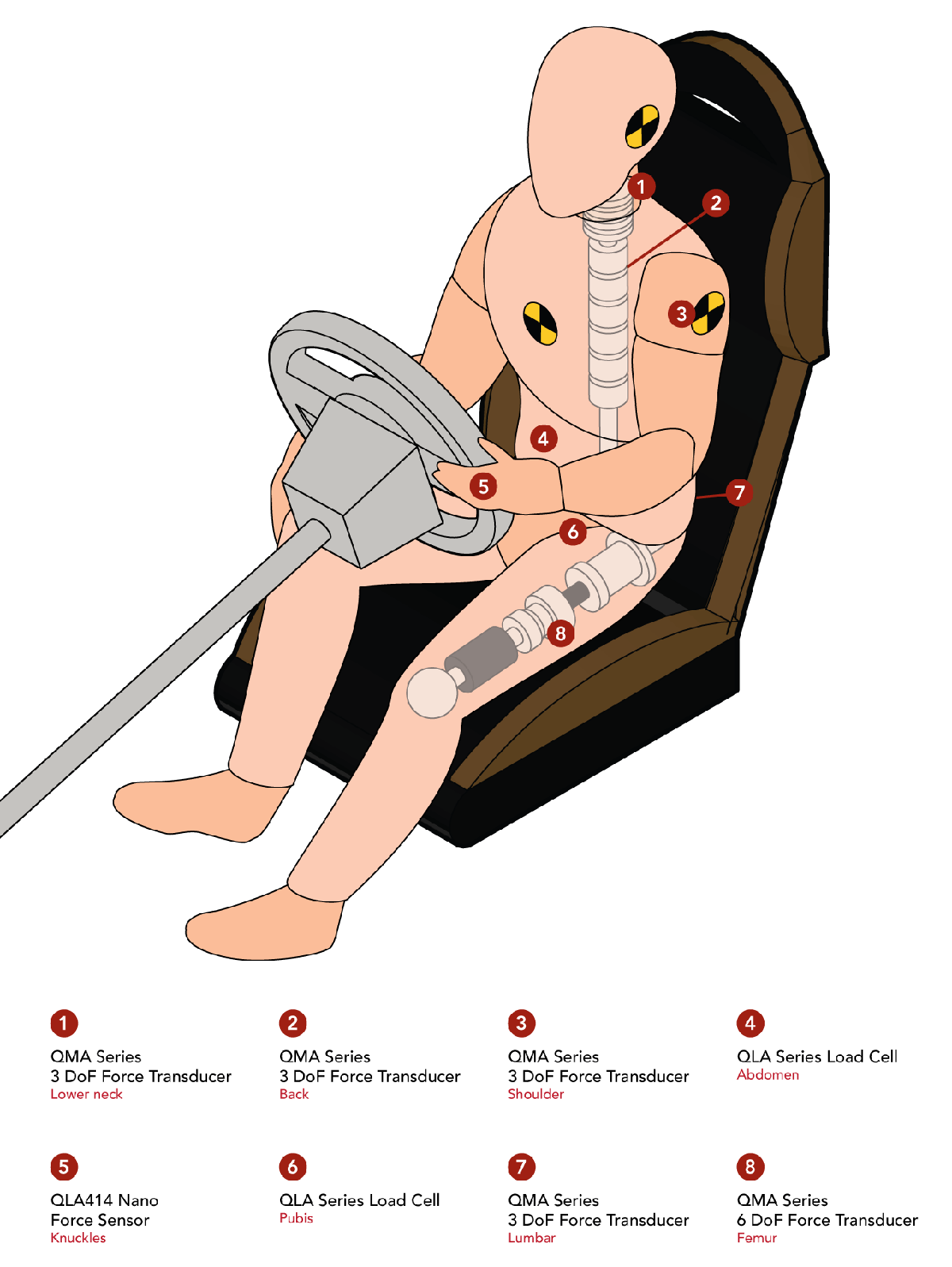 碰撞试验用的人体模型 – 通常也叫做试验假人 (ATDs) – 是一种用在交通碰撞试验中反馈人体所遭受伤害的高精度汽车试验装置。 它可以模拟出在发生交通碰撞事故时人体各部位和关节所遭受力的方向和程度。在试验假人身体关键部位和肢体关节处安装有碰撞测试用的传感器, 同时装配有采集系统, 以记录不同情况碰撞时部位产生的偏移、 加速度和力。 例如, 试验假人躯干处的传感器记录其受到碰撞的合力程度和方向。 研究员和测试工程师用记录到的数据来分析和预测在碰撞中人体受到的伤害, 并研发更安全和更符合人体工程学的交通工具。在开发出碰撞试验假人之前, 曾经用过人类尸体、动物或者活人来测试交通碰撞时的安全性。 后来工程师们掌握了在假人模型上集成传感器来测量碰撞时力、 加速度、 冲击和位移的技术, 他们才能更好的去预测人体这样的伤害, 比如肋骨骨折、 胸部偏移、 脑震荡、 肢体骨折、 肌肉和软组织的伤害。一个碰撞试验假人上, 遍布集成有超过200个传感器, 包括力传感器、 扭矩传感器、 加速度传感器、 位移传感器。这类模型中具体会用到哪些传感器呢?在试验假人中, 米兰(中国)、 力-扭复合型传感器是少不了, 比如他们通常位于头颈、 背脊、 肩关节、 腹部、 指关节、 耻骨、 腰部和腿骨等部位。力-扭多轴传感器能及时地测出试验假人在多个方向受到的力矩大小和方向, 比如六轴传感器能测三维互相垂直的力 (Fx, Fy, Fz)、 以及绕着力方向产生的扭力 (Mx, My, Mz), 并转换成可测量的电子信号。米兰网页版提供了大量的力-扭传感器选项, 非常适合碰撞试验假人的应用。米兰网页版对内的技术精湛多样的工程师团队同时开发出了先进的、 独特的、 性能可靠的传感器和输出来满足你的应用需求。 米兰网页版力-扭多轴碰撞测试传感器符合美国国家高速公路交通安全管理局FMVSS 208的试验程序和安全要求。