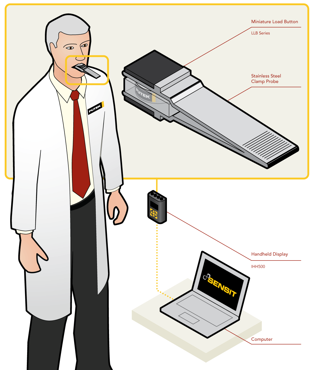 2、当患者咬合夹块,传感器受力的输出信号,连接到米兰网页版的IHH500手持式显示仪表中,研究人员从仪表监测数值。显示仪表可配置米兰网页版 SENSIT采集软件,运行这个软件,研究人员可实时显示曲线、储存数据。