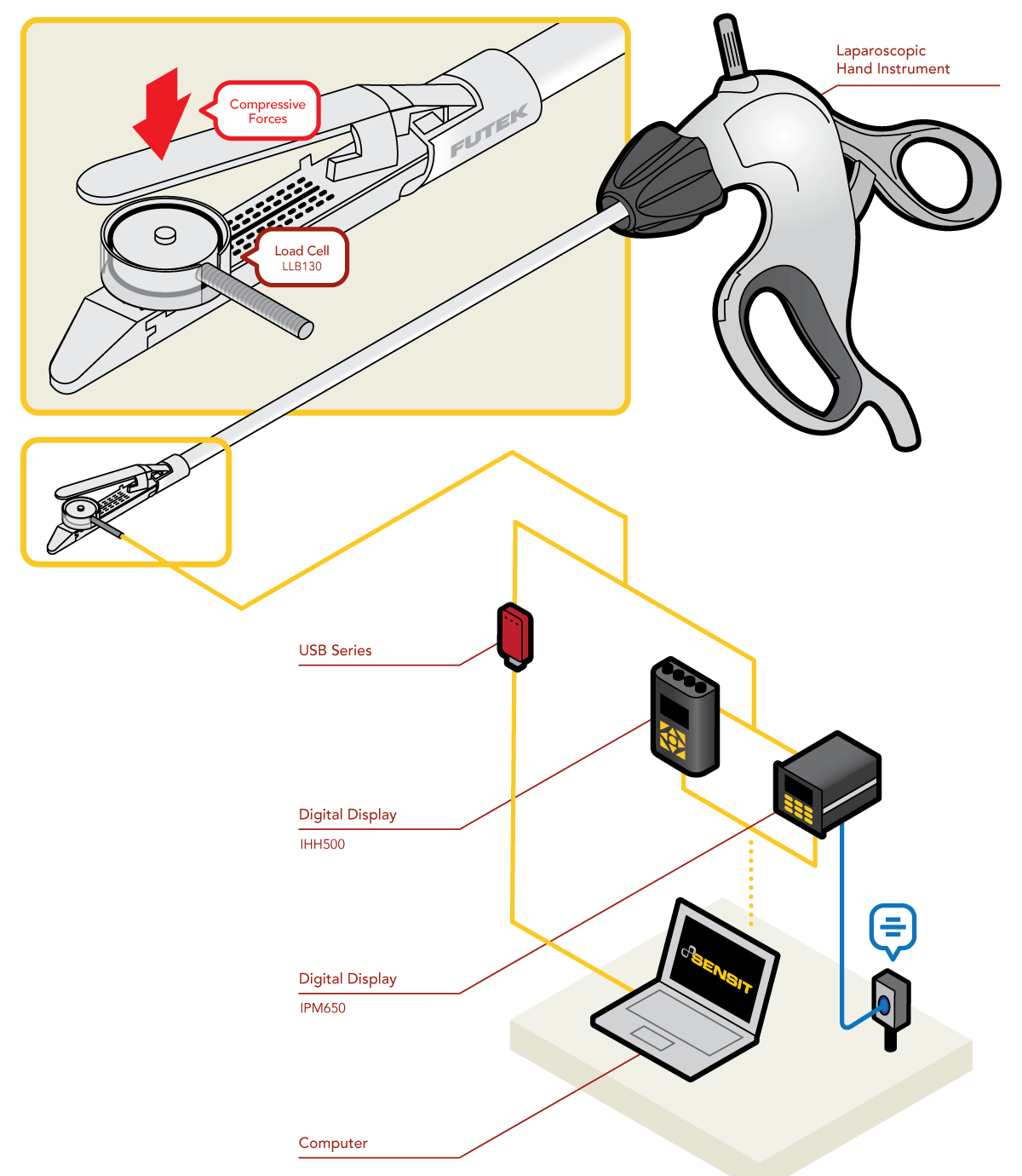 2、在这个应用中,米兰网页版 的微型按钮型力传感器(LLB130)安装在腹腔镜手器械的抓取端。测力元件记录力测量值,可用于校准工具。