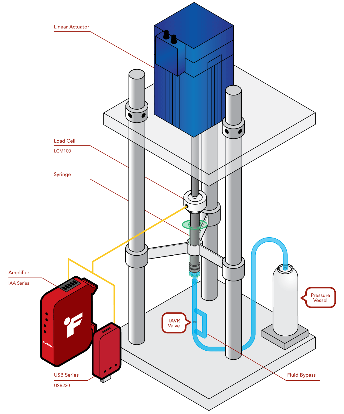 1、LCM 系列或 LSB 系列拉力传感器与线性执行机构和注射器活塞同轴线,测量注射活塞施加在注射器活塞上的力,进行测试验证。
