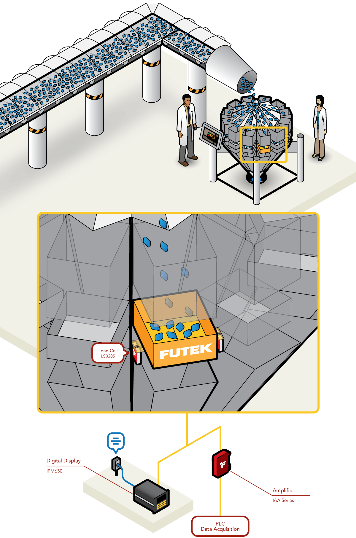 3、在该应用中,每个分配器上安装两只米兰网页版 LSB200微型力传感器,LSB200(带10倍于量程的过载保护)称量分配器中产品的数量。