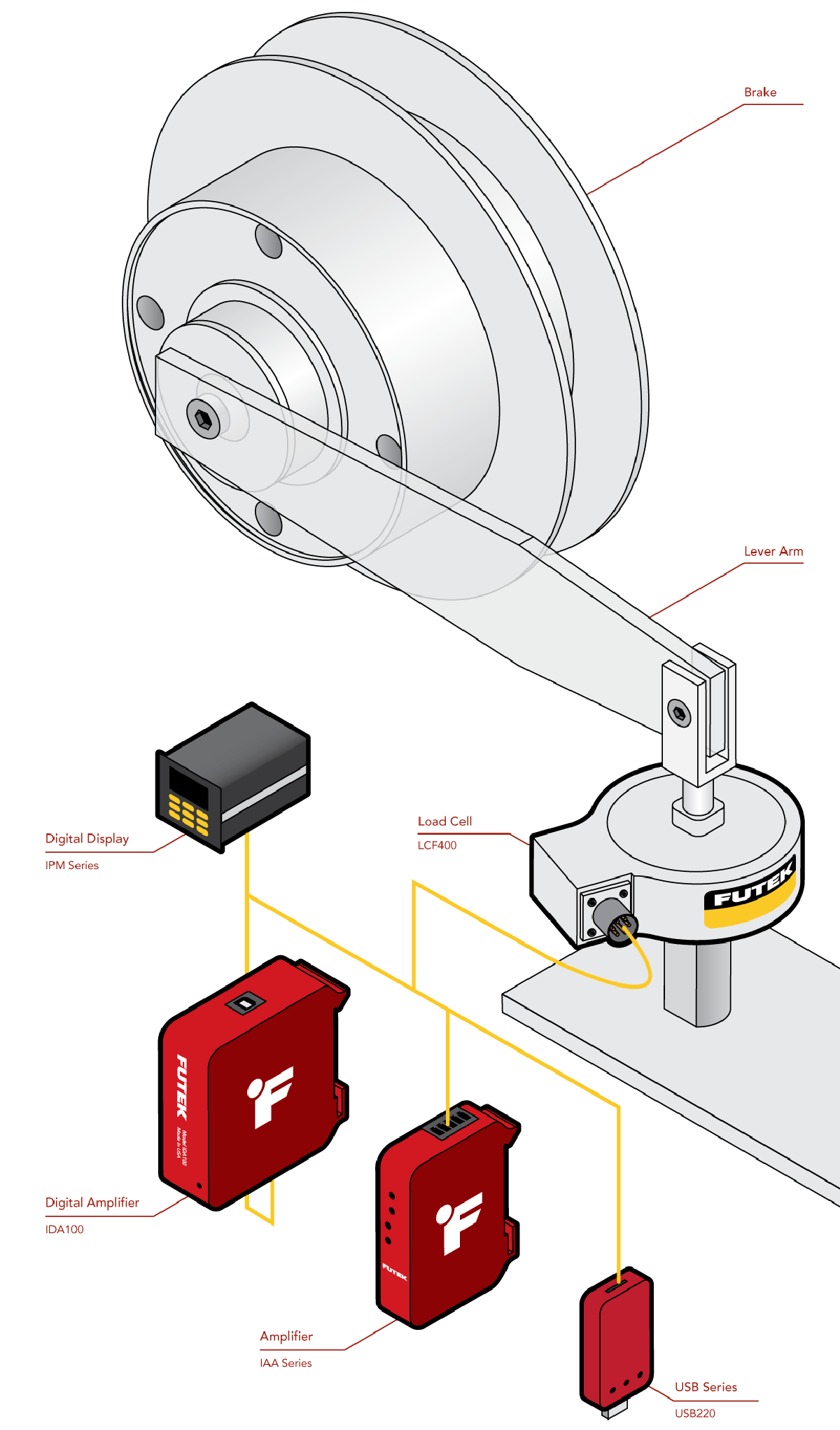 2、在力矩臂的末端,安装一个LCF400轮辐式拉米兰(中国),以测量电机或制动器产生扭矩时通过臂产生的力。