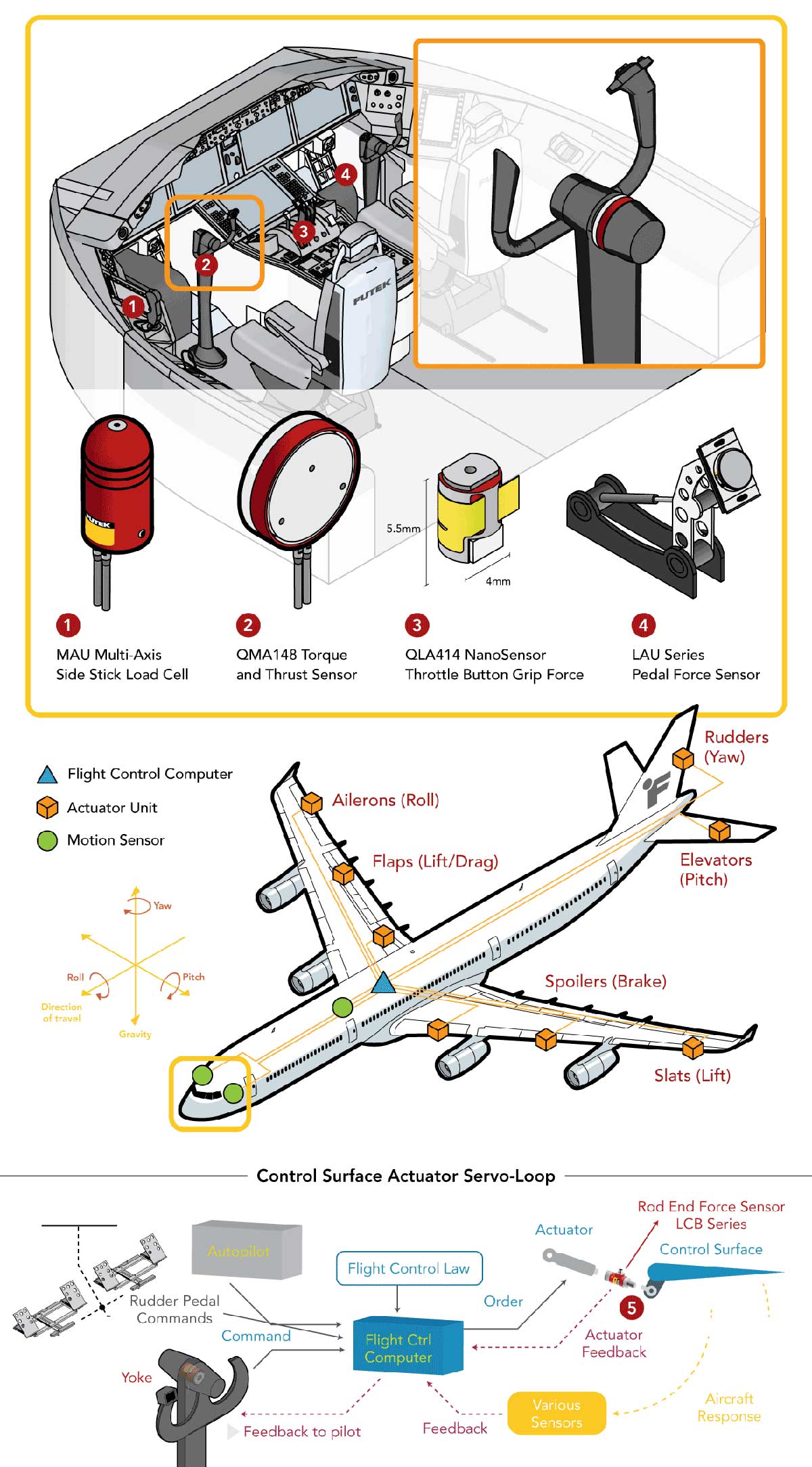2、轭架:飞行员严重依赖控制柱(轭)来引导飞机的俯仰和滚动,通过旋转轭架,飞行员在滚动轴上机动。通过向前和向后推动轭,飞行员可以调整仰角和俯仰轴。为了确保控制柱正常运行,飞行控制工程师可以安装米兰网页版的MBA500扭矩和推力双轴传感器,以测量施加在轭架飞行控制上的力和扭矩。MBA500 多轴力传感器在 Mz(滚动)和 Fz(俯仰)方向上执行测量。